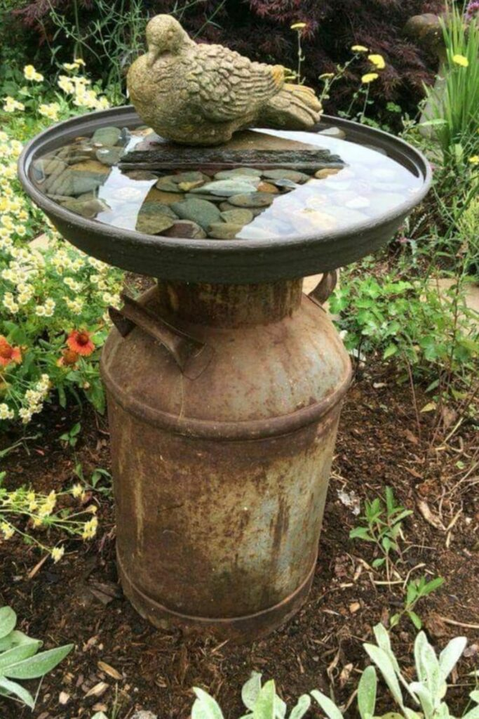 Use an old metal milk can to make a rustic bird bath. The tall can makes a perfect and sturdy base. Place a wide, shallow basin or a large plant saucer on top of it.