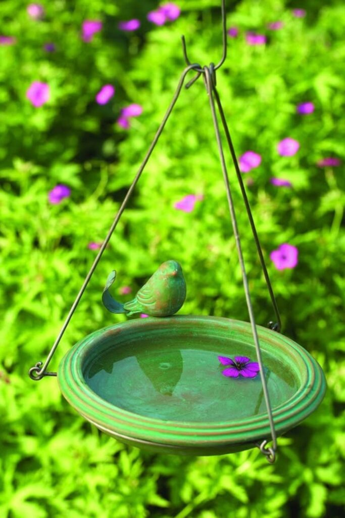 A hammered copper bowl makes a beautiful hanging bird bath. The metal has a warm, shiny glow. Suspend it from a black wrought-iron hook or a shepherd’s crook stand.