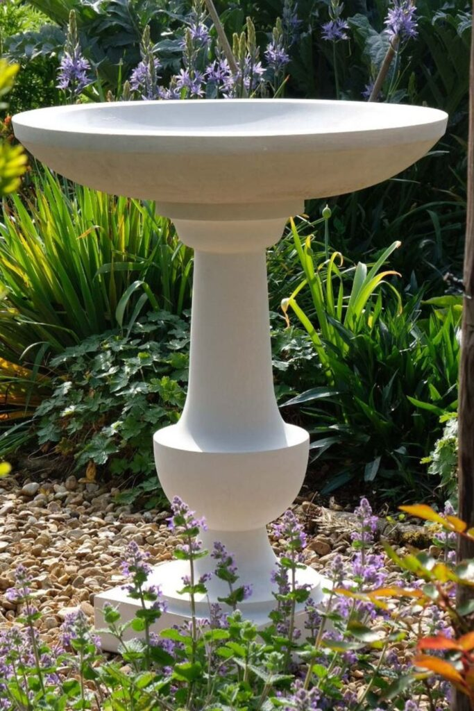 Choose a bird bath with a very modern shape. Look for one with straight lines and sharp angles. A glossy white finish makes it look like a piece of art.