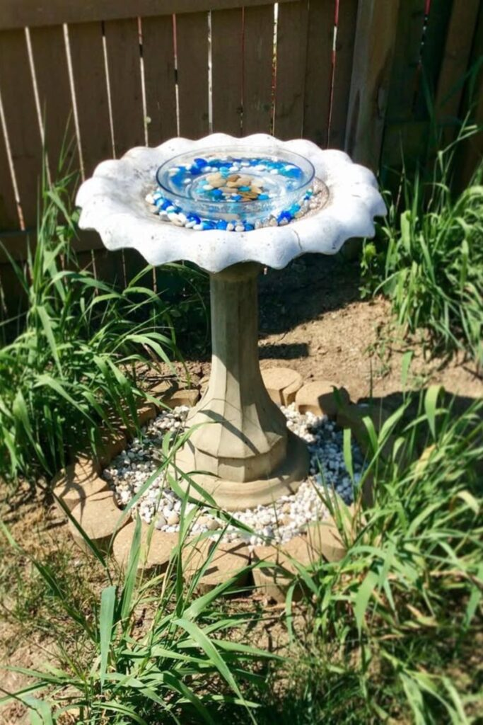 Use a clear glass bowl as the top of your bird bath. Fill it with colorful glass gems or smooth stones. Place this bowl on a classic pedestal base.