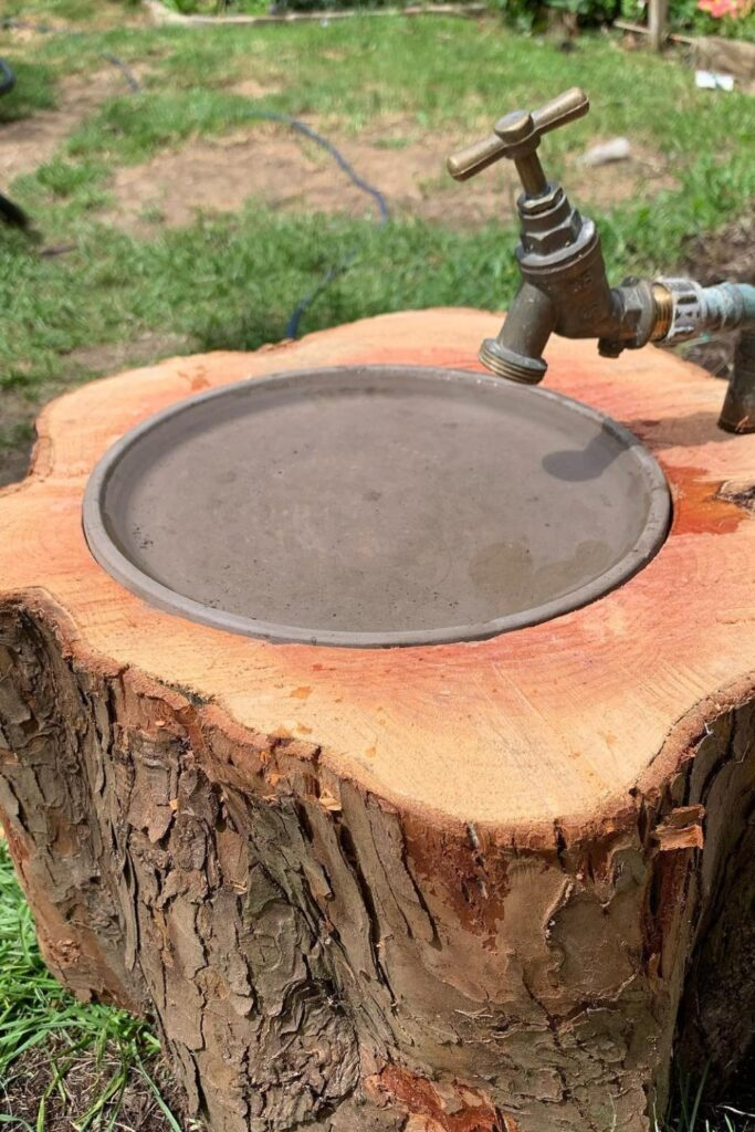 Attach an old-looking faucet to the side of the stump, pointing over the bowl. It won’t really have water, but it looks charming. This idea fits perfectly in a woodland or natural garden.