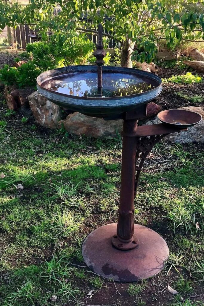 Add a metal basin or pan to hold the water on top. The rust and patina on the metal give it character. This is a great idea for a garden with an edgy, rustic, or steampunk style.