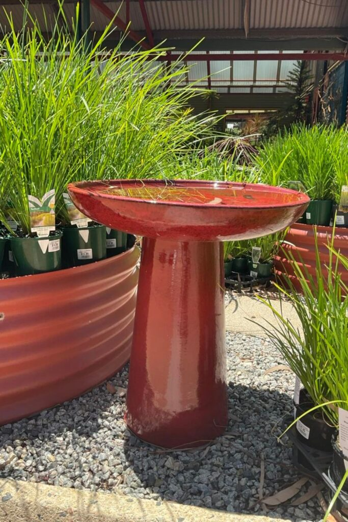 A bird bath with a shiny, red ceramic finish is very striking. The red color is bright and happy. The smooth, glossy surface reflects light.