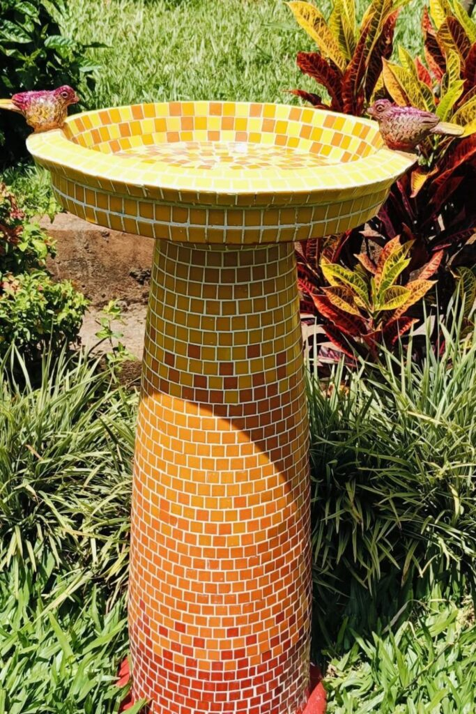 Cover a bird bath with yellow and orange mosaic tiles. You can use broken tiles or buy small pieces. Stick them onto a plain concrete bath with outdoor adhesive.
