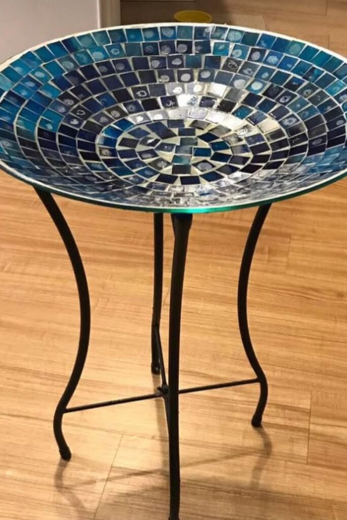 Create a cool, coastal feeling with blue mosaic tiles. Use different shades of blue and some silver tiles to look like water. Cover the bowl and pedestal of a plain bird bath.
