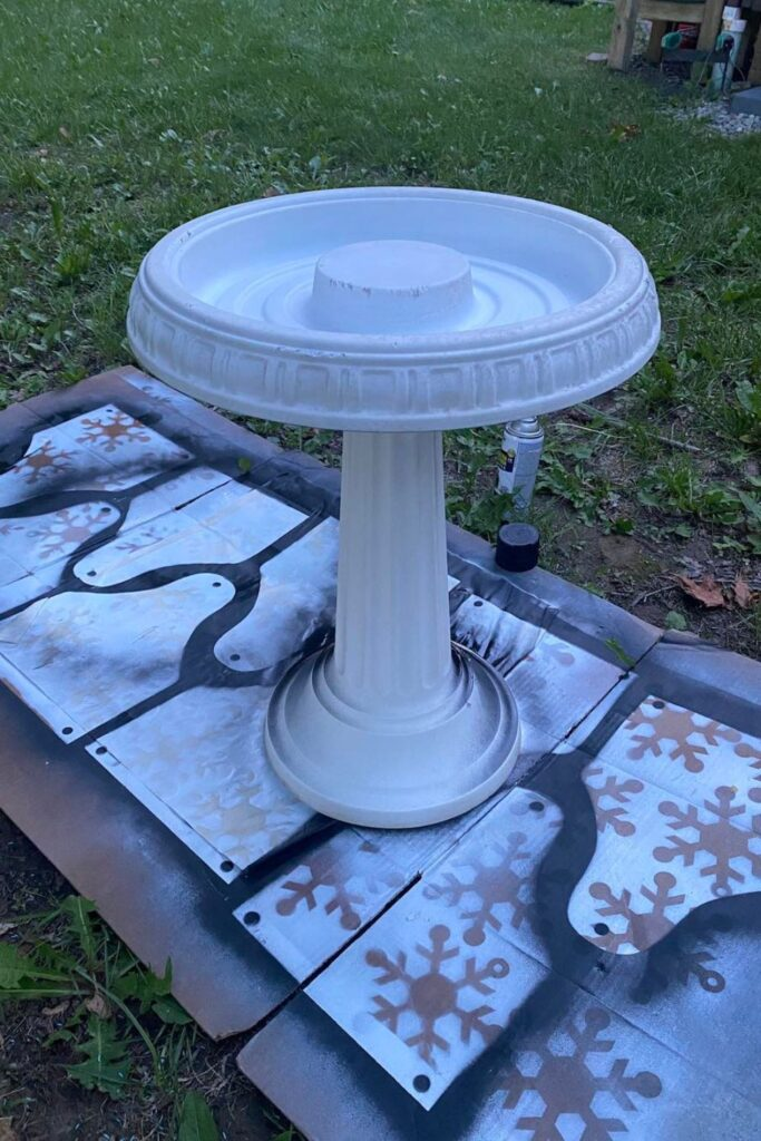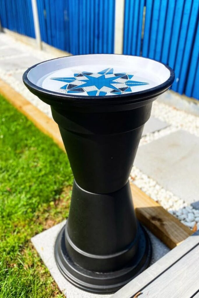 Decorate a terracotta bird bath with a bold star pattern. Use black and white tile pieces or outdoor paint to make a striking design on the basin.