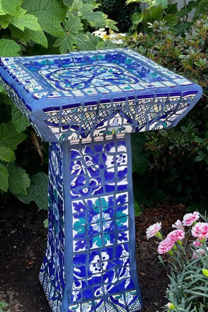 Make a square bird bath with mosaic tiles. Use a square plant saucer for the basin and a square block for the base. Cover all sides with blue and white mosaic tiles.