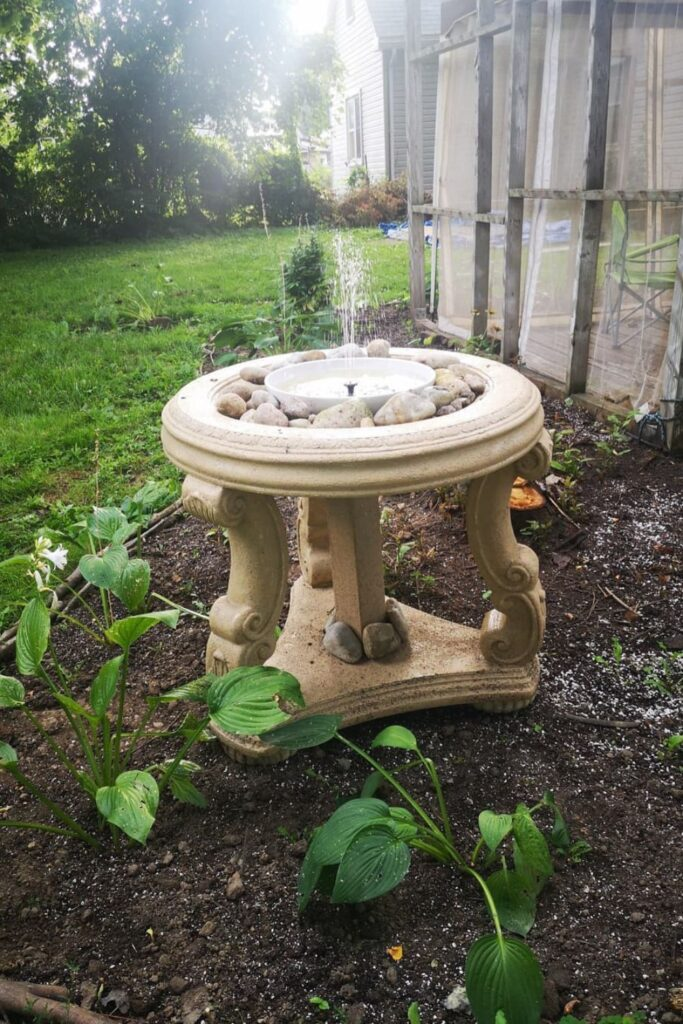 Top it with a pretty, shallow glass bowl for the water. The sunlight will shine through the glass, creating sparkles. This is a great way to reuse old treasures and add sparkle to a shady spot.
