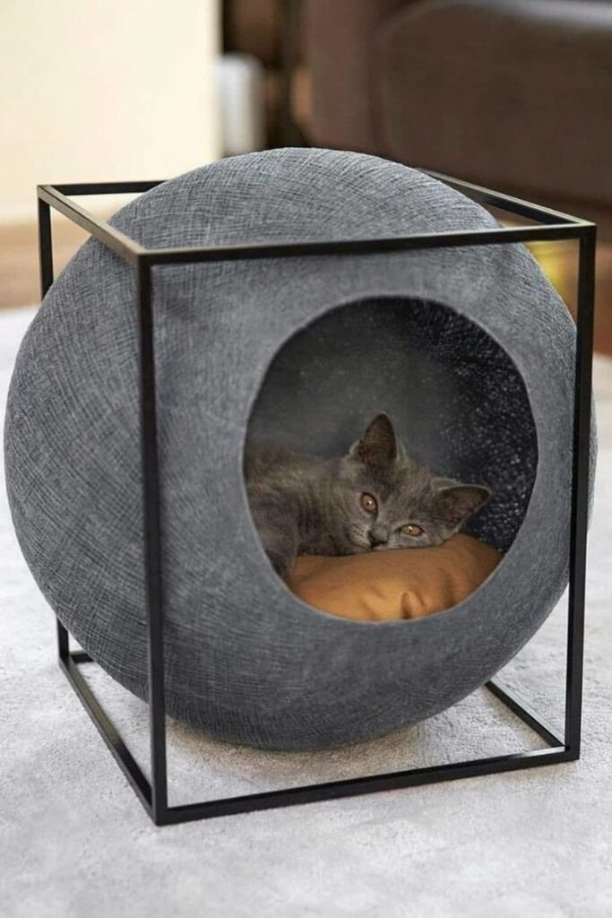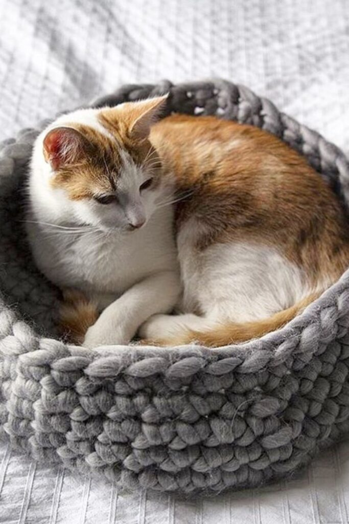 It fits well in bedrooms or living rooms where your cat is relaxed. You can make it by arm knitting or crocheting with thick yarn into a big round shape. Make the sides high enough for curling up.