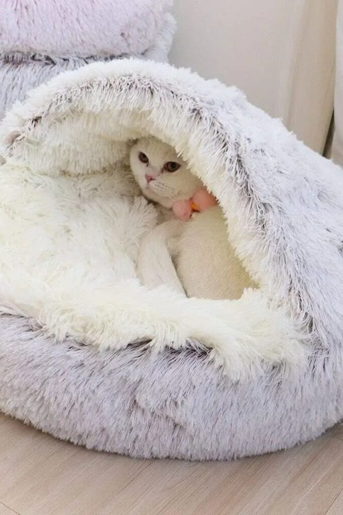 A donut bed with a hood is deeply soft. The high hood blocks light. The round base lets your cat curl up tight for warmth and security.