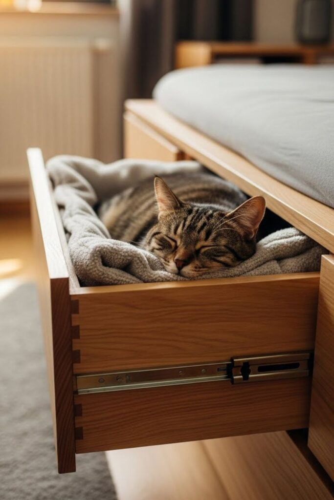 It becomes a quiet sleep zone. This works well in closets or bedrooms. Put rubber pads under the drawer so it does not slide when your cat jumps in.