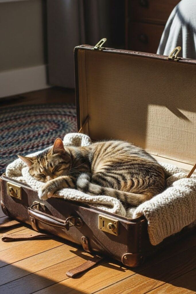 An old suitcase feels like a ready-made nest. The hard sides are protective and the depth is perfect for curling up. Tuck it under a bed or in a guest room.