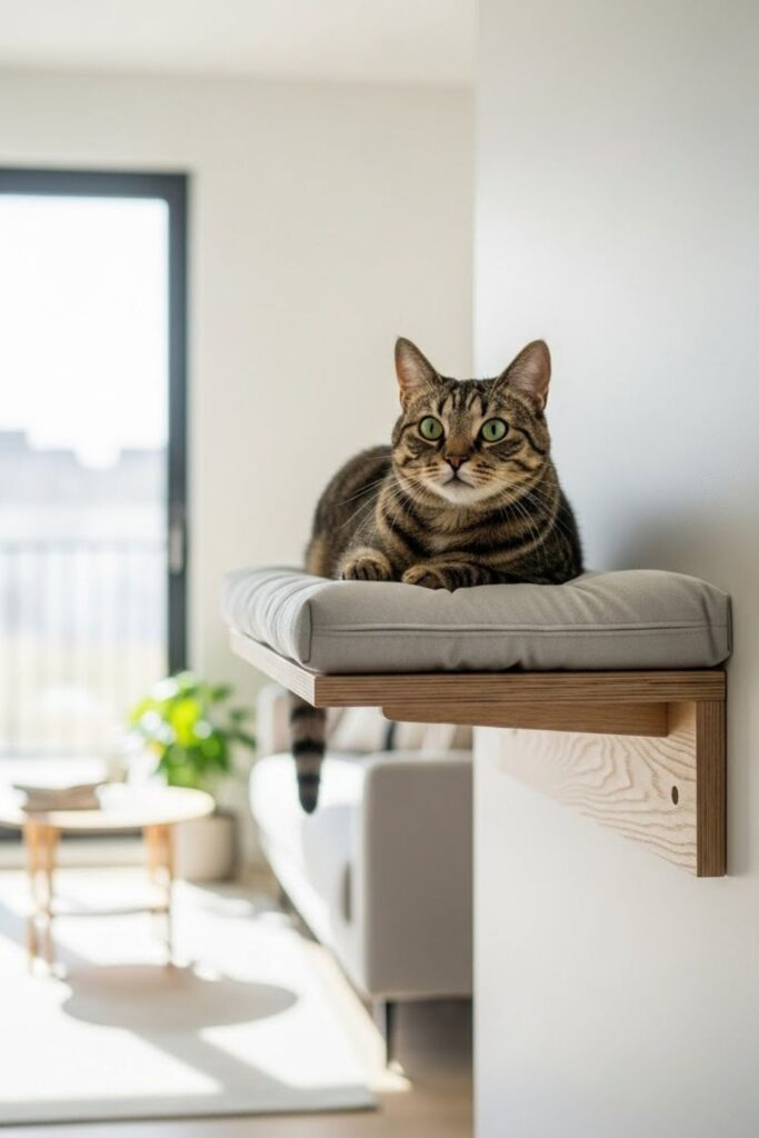 Cats feel calm when they are up high. A simple wall shelf with a pad gives them a perch without a whole cat tree. This is great for living rooms or home offices.