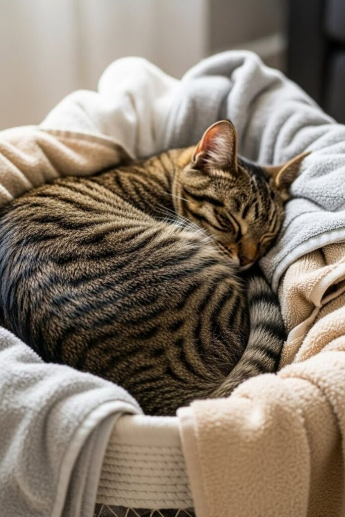 An old sweater on a chair is cozy and smells like you. A drawer, a basket, or even a shelf with a towel can become a great resting spot. If it is warm, familiar, and a little enclosed, your cat will use it.