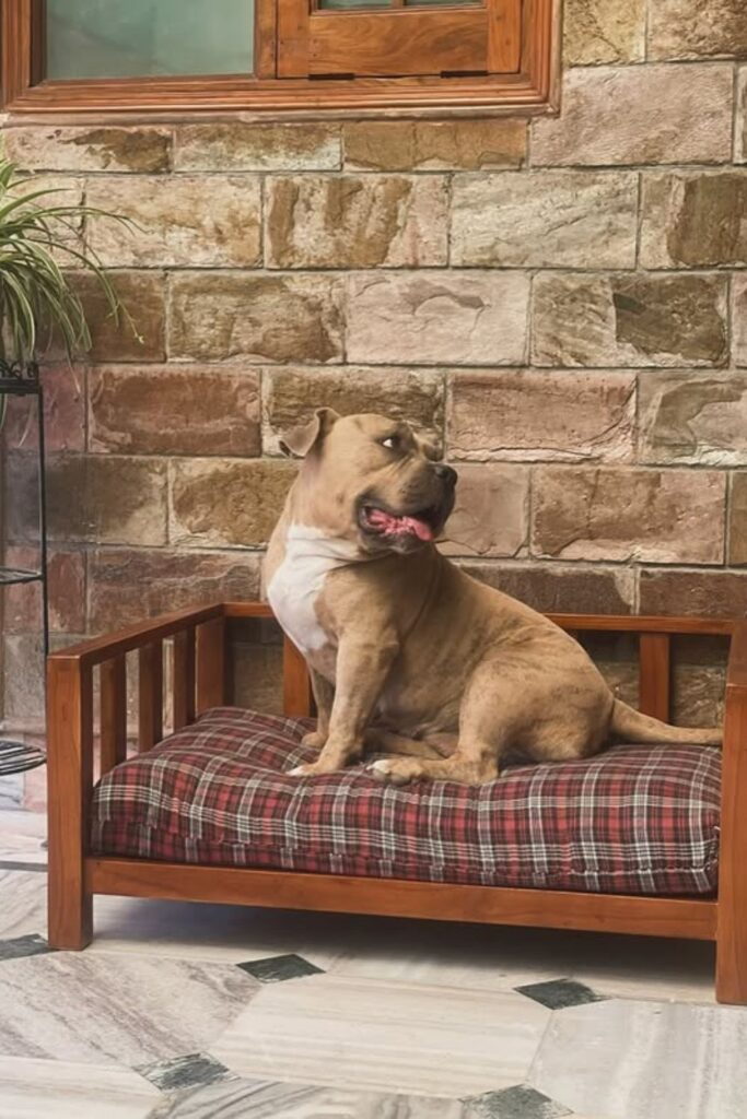 Dogs that love to stretch out enjoy furniture-style beds with open sides. A curved wooden base lifts the cushion slightly.