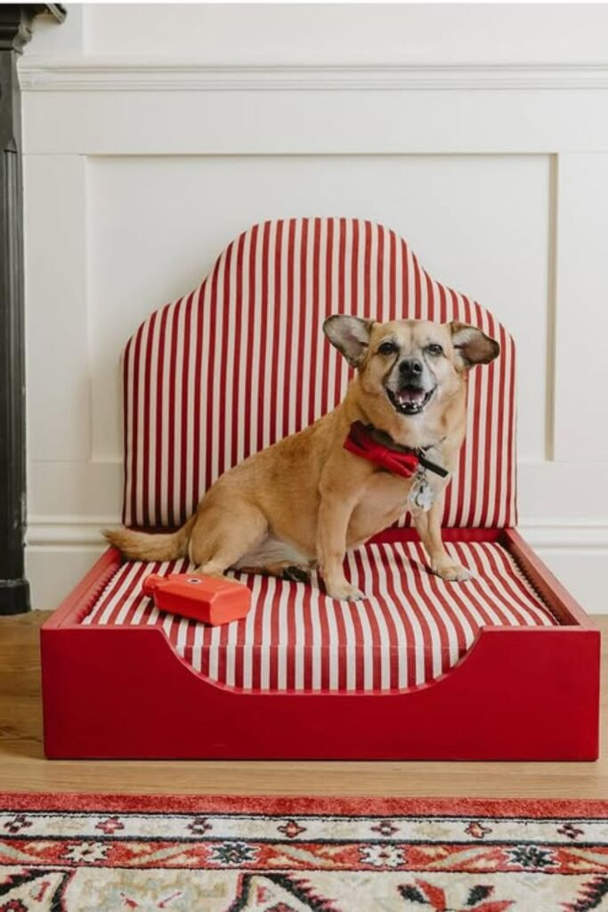 A high-backed frame is good for small dogs that like to sit up and look around. Build a shallow wooden base and add a padded back panel.