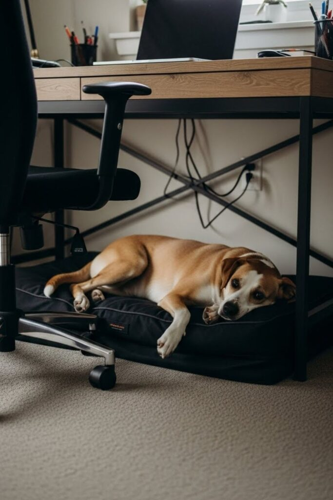 Some dogs will not relax unless they are near you. A slim bed that slides under your desk solves this.