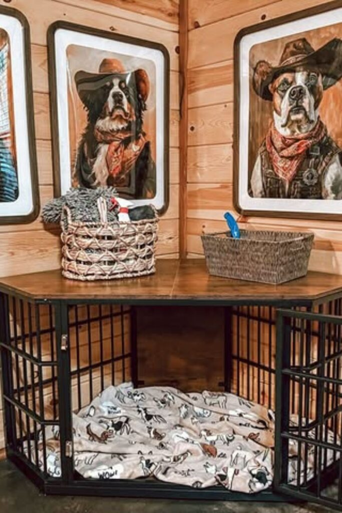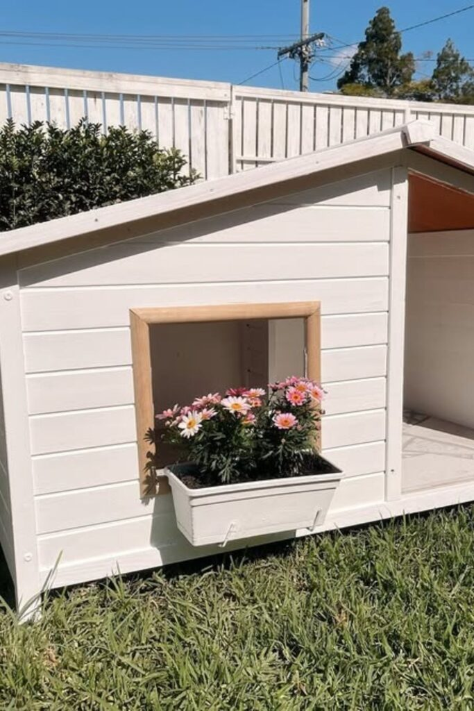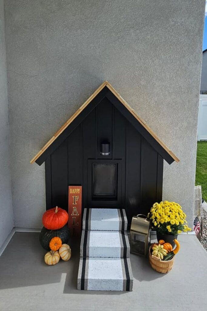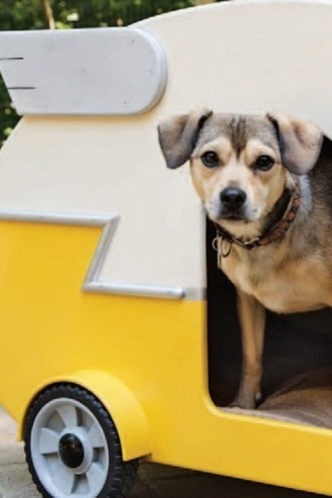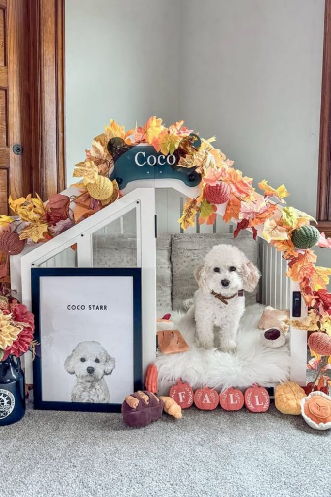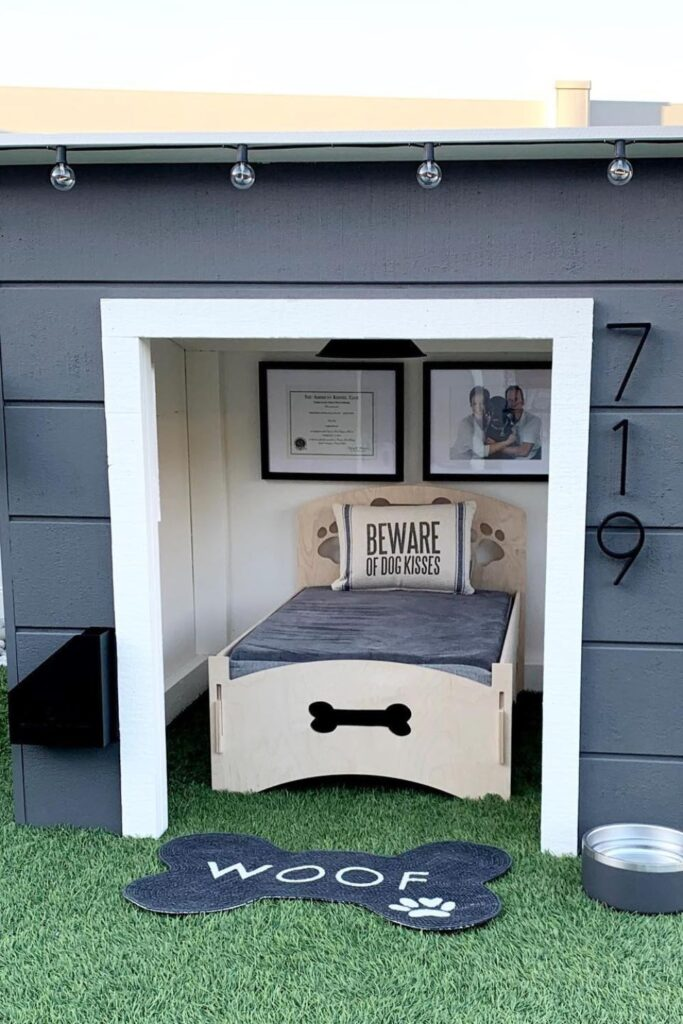 This idea works best inside your home. Start with a simple wooden dog house. Add a soft cushion, a sign with your dog’s name, and some light decorations on the roof.