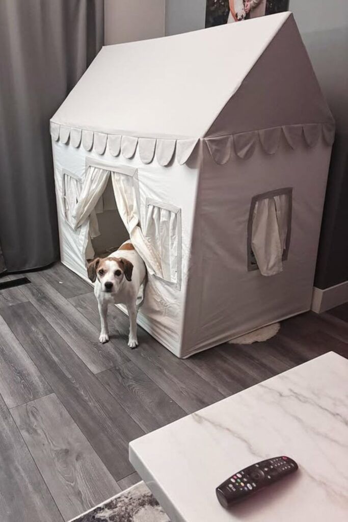 This is a soft, den-like space for indoor dogs. It uses a lightweight frame, like PVC pipes, covered with washable fabric panels. Curtains at the door give privacy but let air flow.