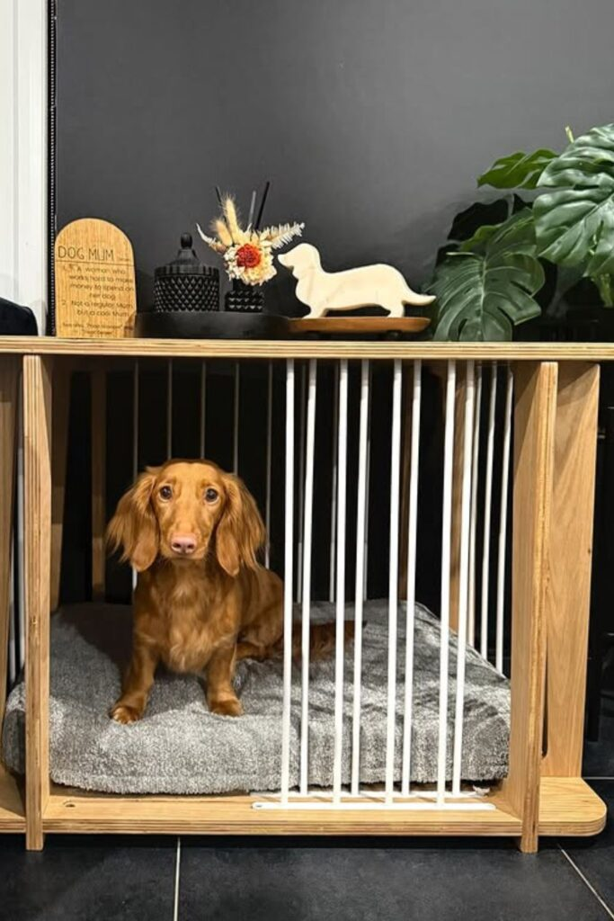This design gives your dog a space that doesn’t look like pet gear. It’s a wooden frame with vertical bars for airflow, and it can work as a side table.