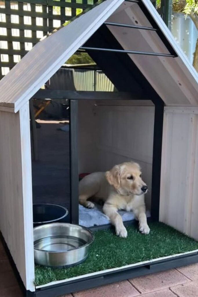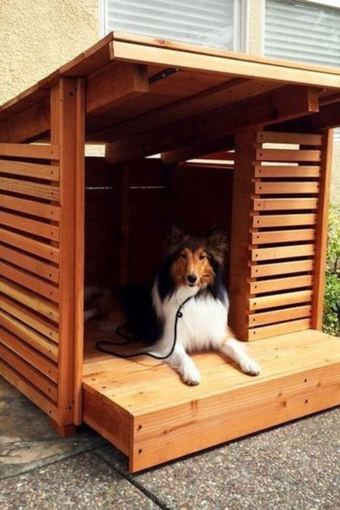 Build it with a simple frame and roof panels held by support arms. It’s excellent for outdoor houses and bigger dogs.