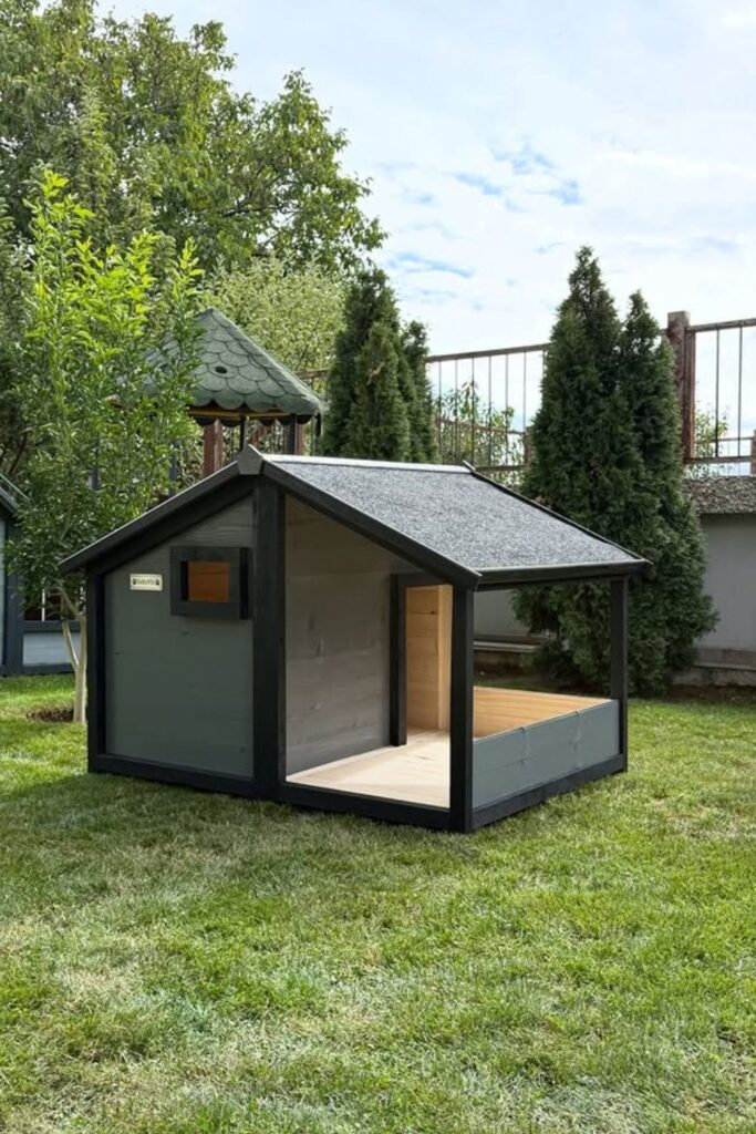 A large roof overhang keeps rain out. It’s great for fenced yards where your dog spends peaceful days outside.