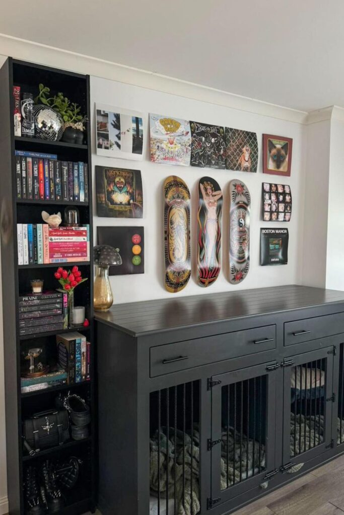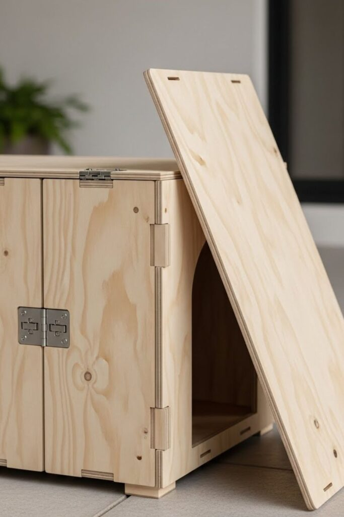 Use hardwood panels and a strong top that can hold decorations. It’s good for small dogs in shared living spaces.