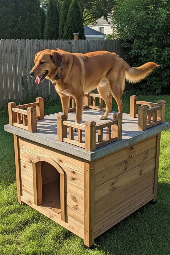 Dogs often like to be up high. This house has a flat, strong roof that acts as a lookout deck, with the sheltered area below. Add safety rails and seal everything well.