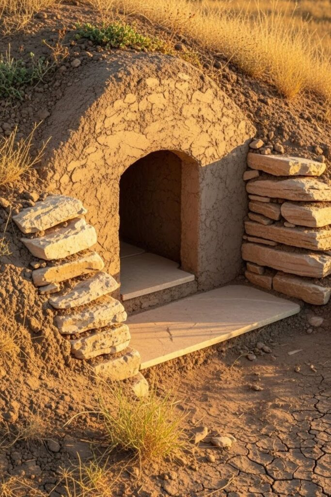 This uses nature to stay cool. Part of the base is set into the ground, and thick walls help control temperature. Keep the inside floor raised to avoid moisture.