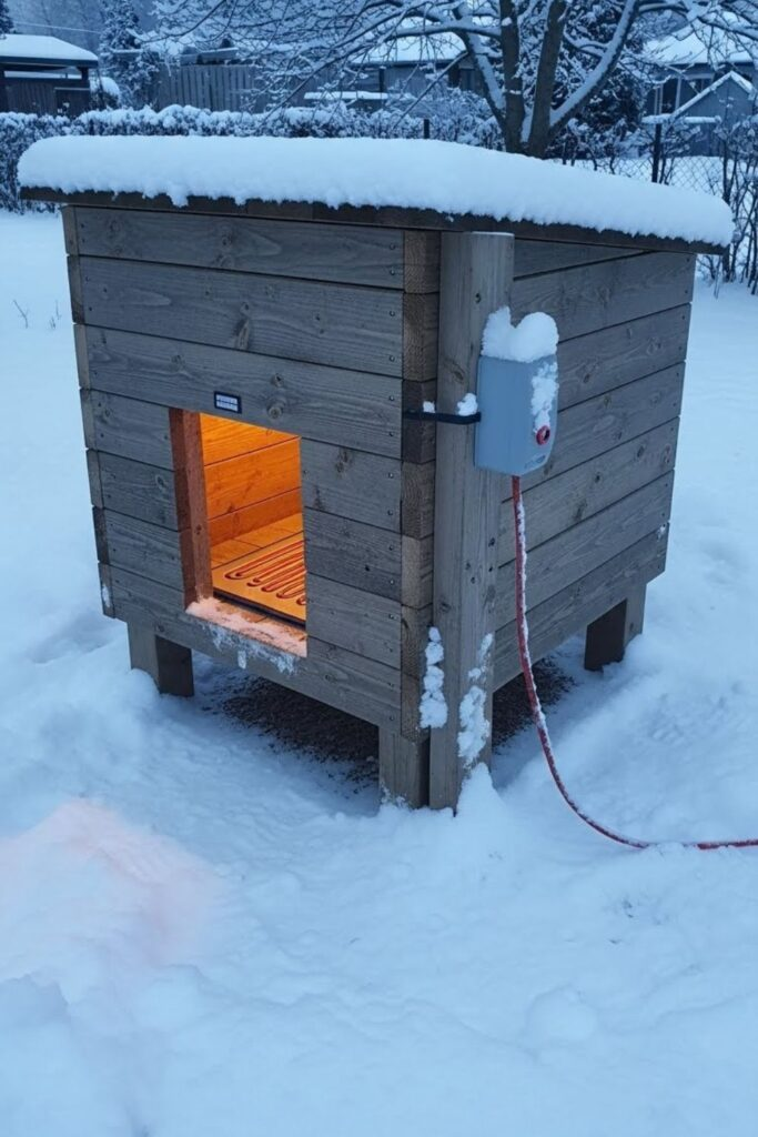 For freezing winters, insulation alone isn’t enough. This is a tightly sealed wooden shell with a safe, low-voltage heated mat inside. Keep wires in covered conduits and raise the floor above snow level.