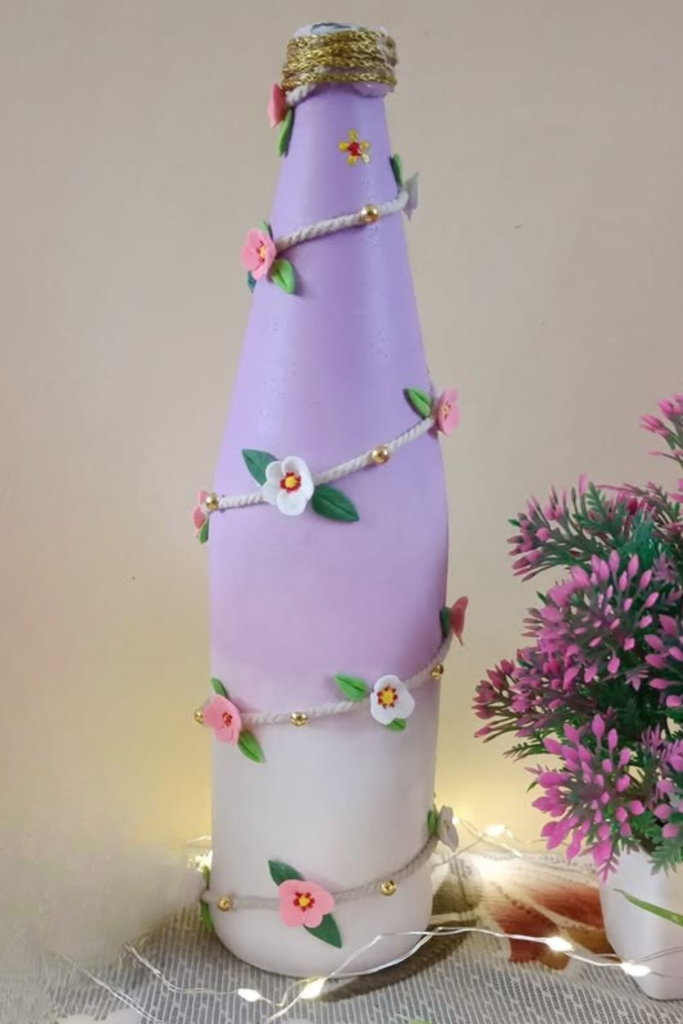 Paint the bottle in a light shade and loosely wrap thin rope around the body to guide the flower placement. Use foam or clay flowers to keep it lightweight.