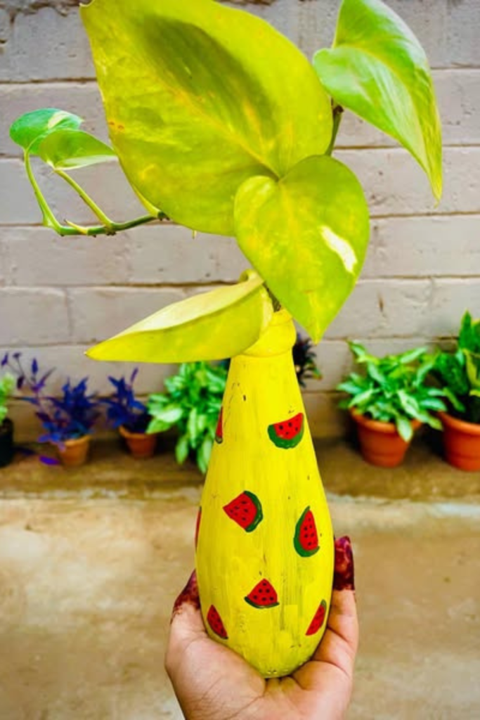 This craft turns a bottle into a bright planter or water-propagation vase. Start with a bold base color and add simple fruit shapes or patterns.