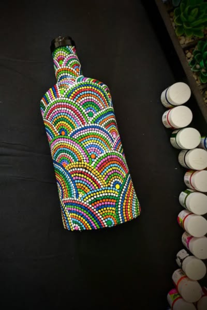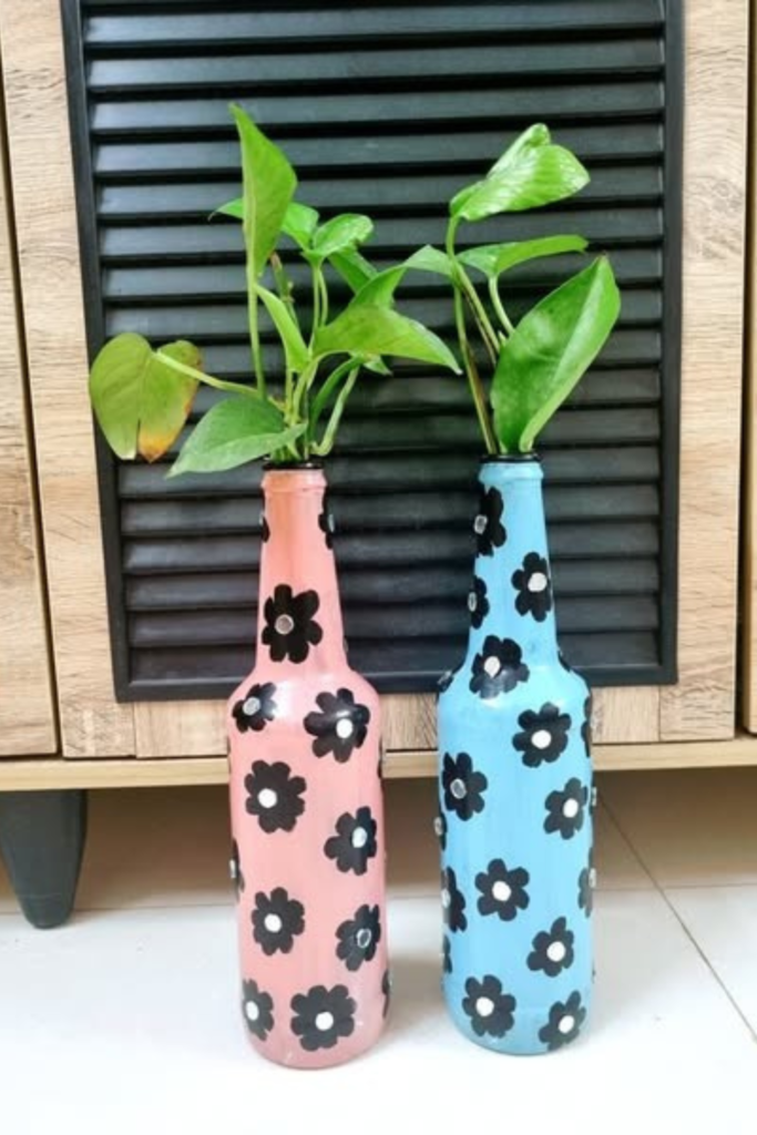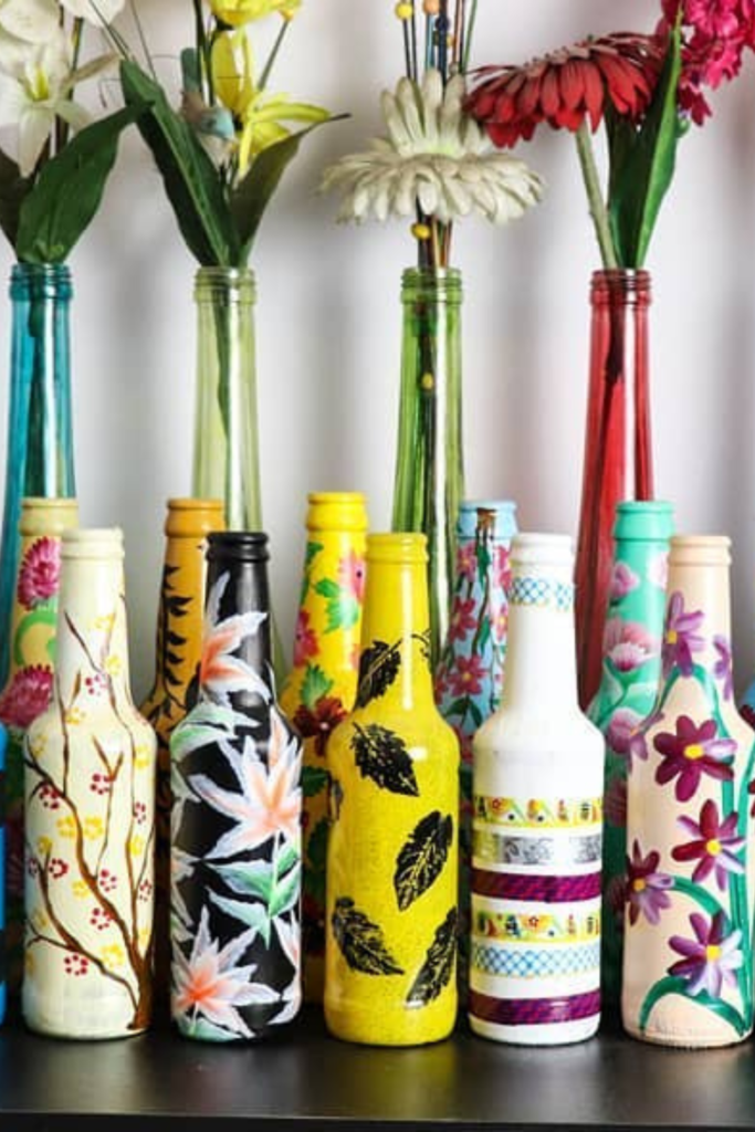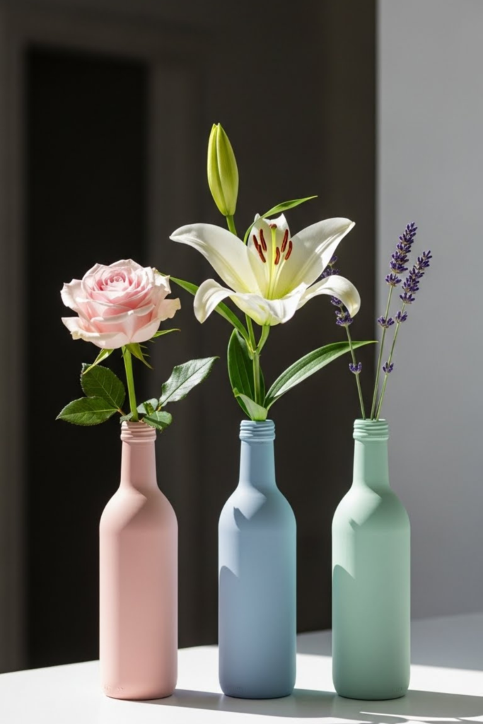 This idea looks best when bottles are painted in different colors but kept simple. Avoid mixing too many patterns so the set feels balanced.