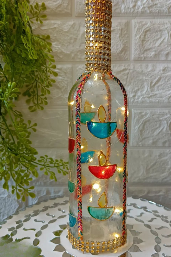 Paint simple diya shapes directly on the bottle and place colorful fairy lights inside.