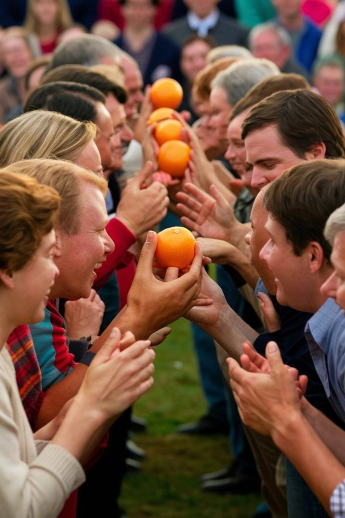 The team that passes the orange to the last player first wins. It is simple, active, and full of laughs.