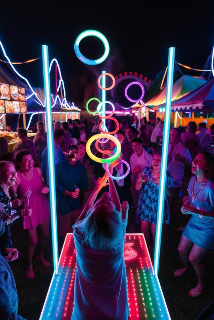 Glow in the Dark Ring Toss uses glow sticks shaped into rings and bottles or stakes as targets. The glowing rings add excitement, especially at night.