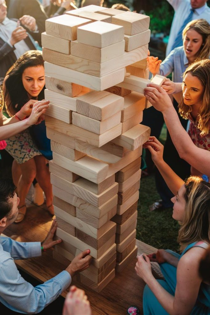 This version of Giant Jenga is designed for outdoor use. Wooden blocks are stacked carefully in layers.