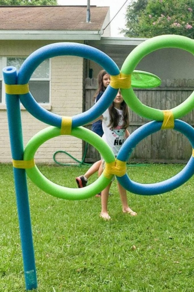 This game uses pool noodles shaped into rings and attached to stakes. The rings act as targets.