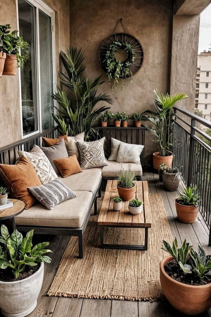 Make a small balcony feel like a peaceful retreat. Build a corner sectional and cover it with soft, neutral cushions.