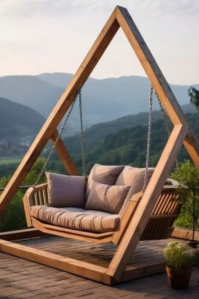 Build a large triangular wooden frame. Hang a floating bench swing from it with soft, tufted cushions.