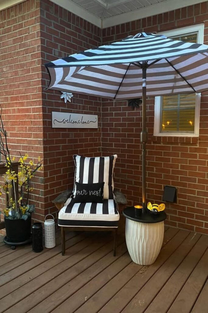 Create a bold lounge area using black and white. Use striped cushions and a matching umbrella.