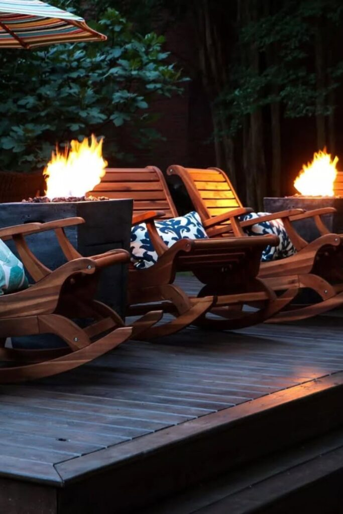 Place curved wooden rocking chairs around your deck. Put a modern firepit in the center for warmth.