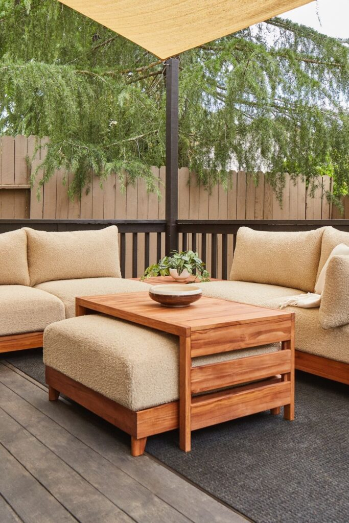 Make a modular sectional from wood for your patio. Use thick, boucle-style cushions to make it very cozy.