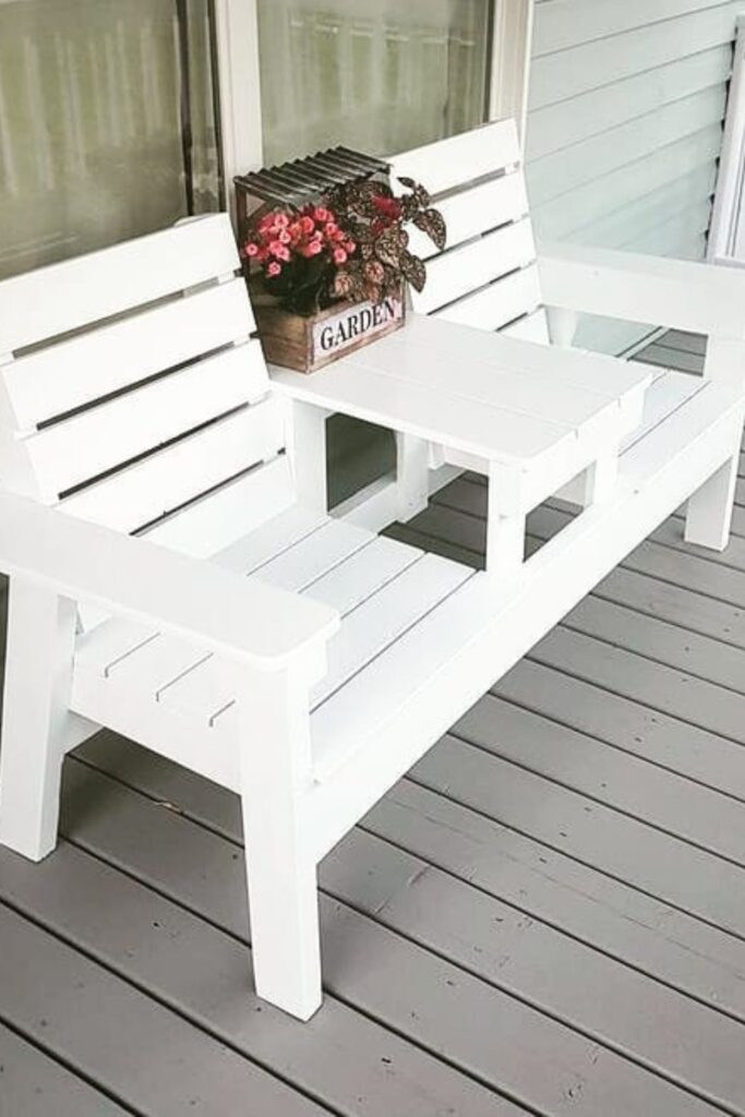 Build a crisp white bench that splits into two separate seats. Include a built-in table in the center.