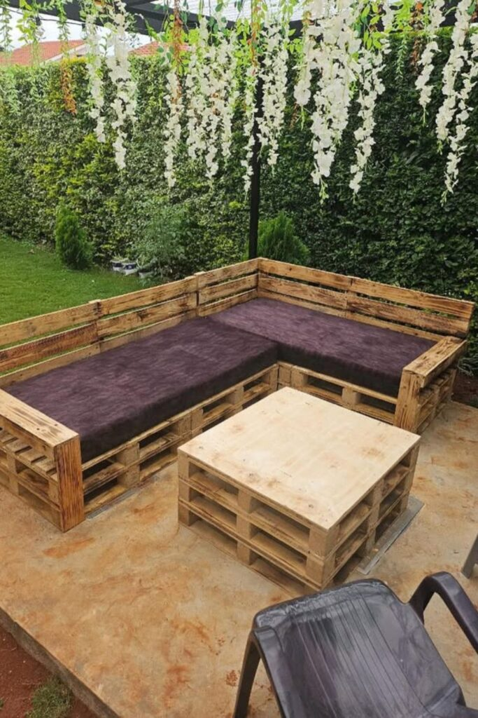 Bring the comfort of your living room outside. Build a low L-shaped sofa from stacked wooden pallets.