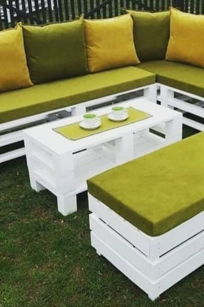 Brighten your patio with a cheerful set made from pallets. Use crisp white frames for the base.