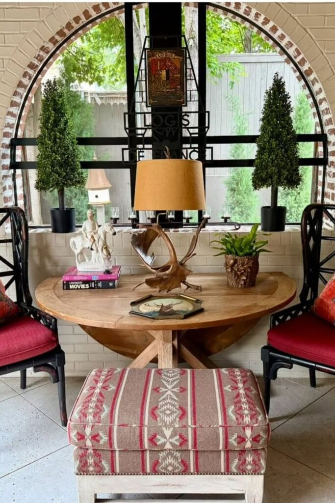Set up a charming nook with a small round table and two vintage-style armchairs. Add a patterned pouf for texture.