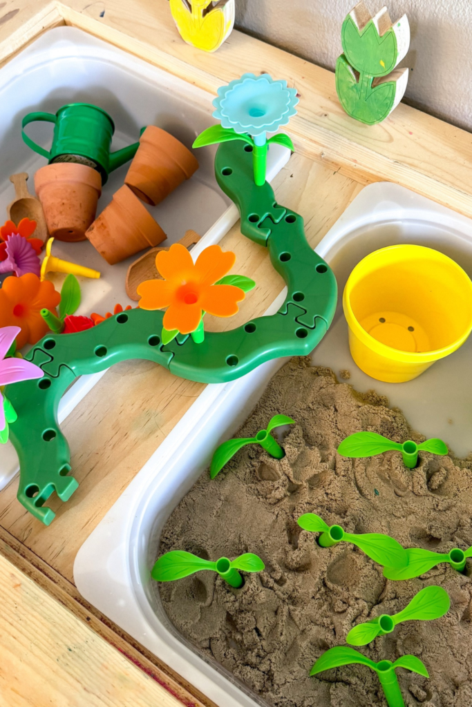 Garden-themed sensory play feels real and keeps kids engaged longer. The bin can be divided into soil and tools using kinetic sand for digging.