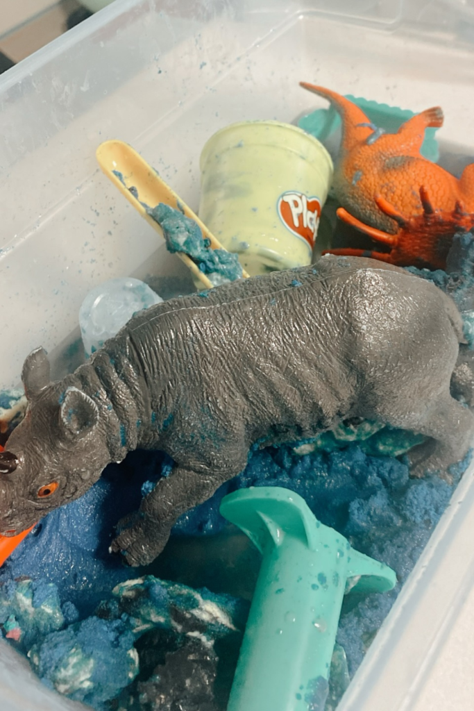 Dinosaur-themed sensory play keeps kids interested and active. Adding dinosaur figures with loose parts helps children stay busy as they move and explore.