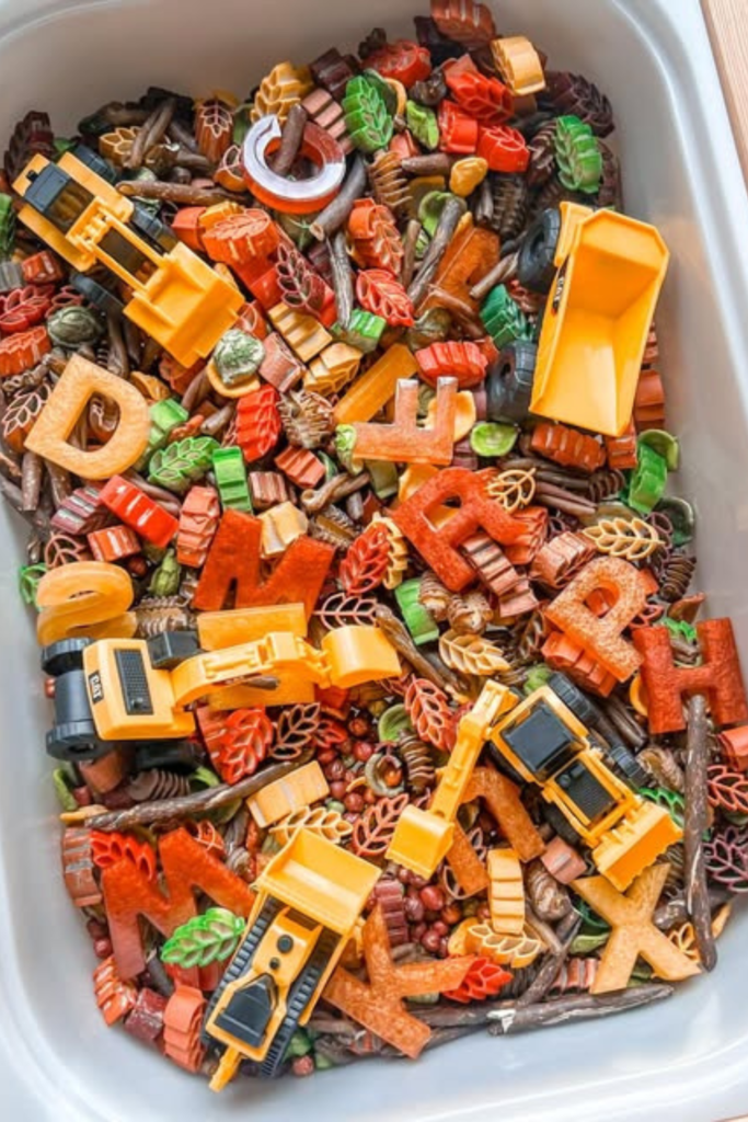 Dyed pasta or beans create a textured base for digging. Construction vehicles turn the activity into a fun mission.